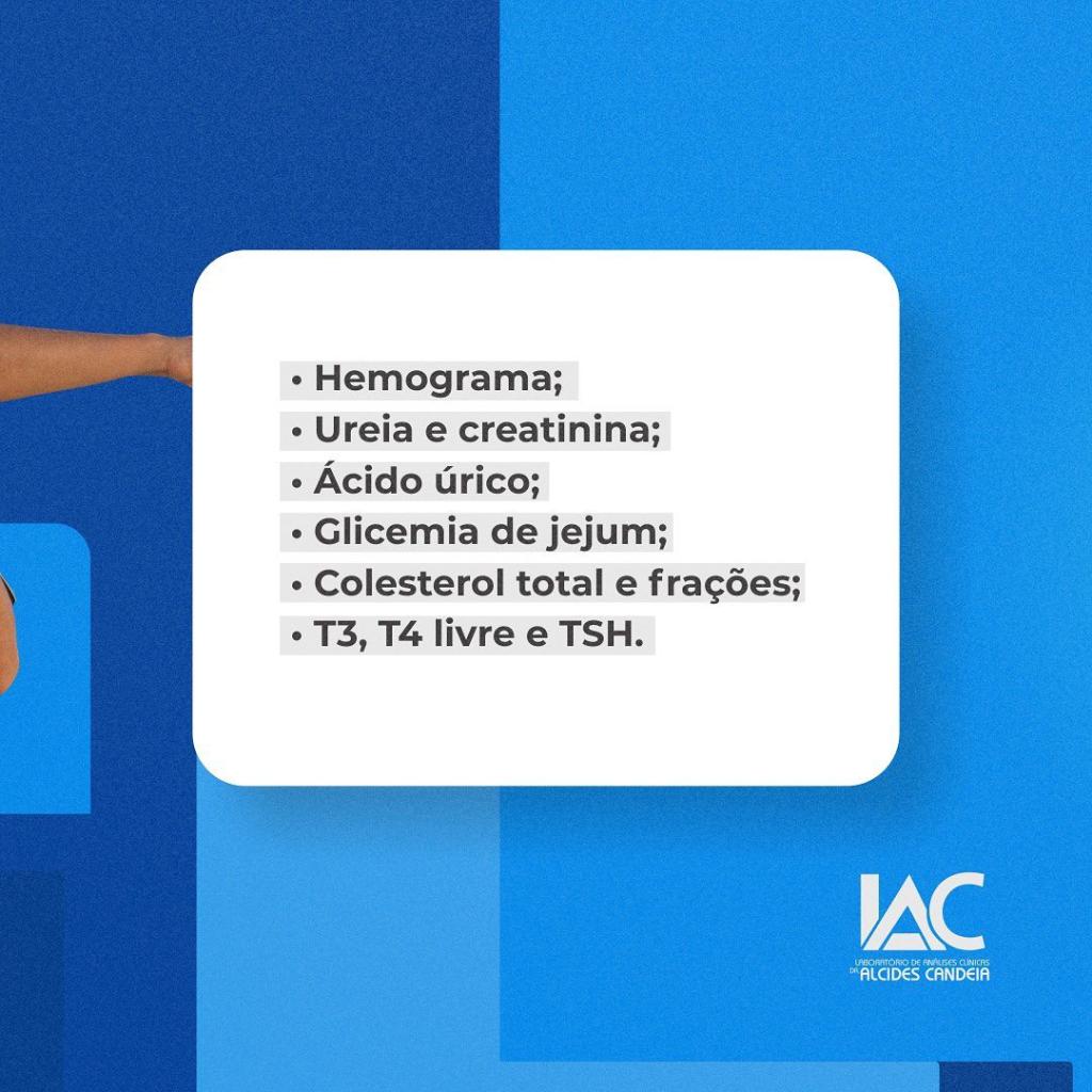 Exames Bioquímicos Bioquímica. Exame de Glicose, Colesterol e Frações, Exames de Trigliceridios, Ureia, Creatina, Ácido Úrico, Cálcio, Hemoglobina Glicada, Exames TGO, TGP, Gama GT, Fosfatase Alcalina, Bikirrubina e CPK. Dúvidas? Estamos a disposição. Agende já o seu através do nosso WhatsApp. SAIBA MAIS